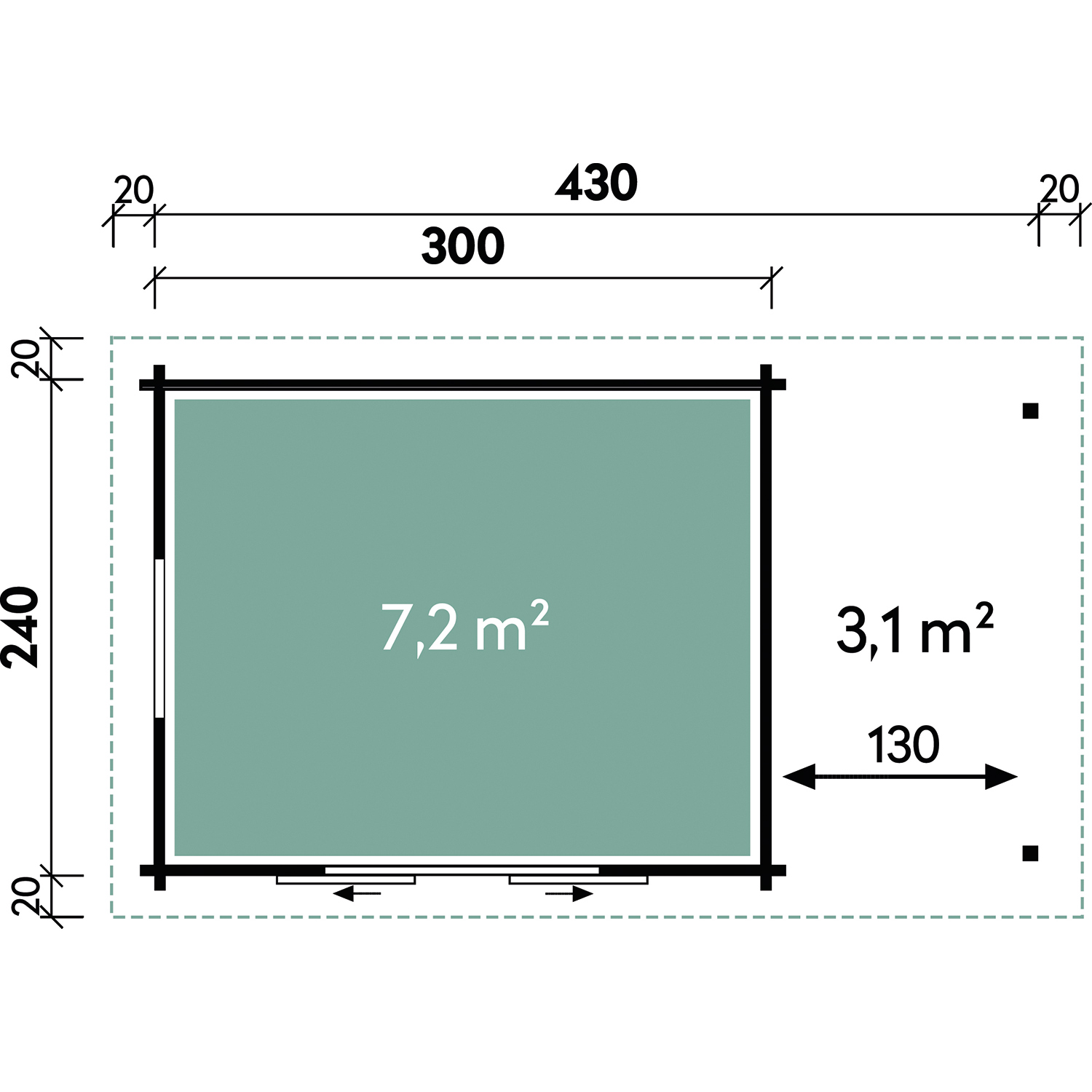 • Wandaußenmaß (B x T) 300 x 240 cm