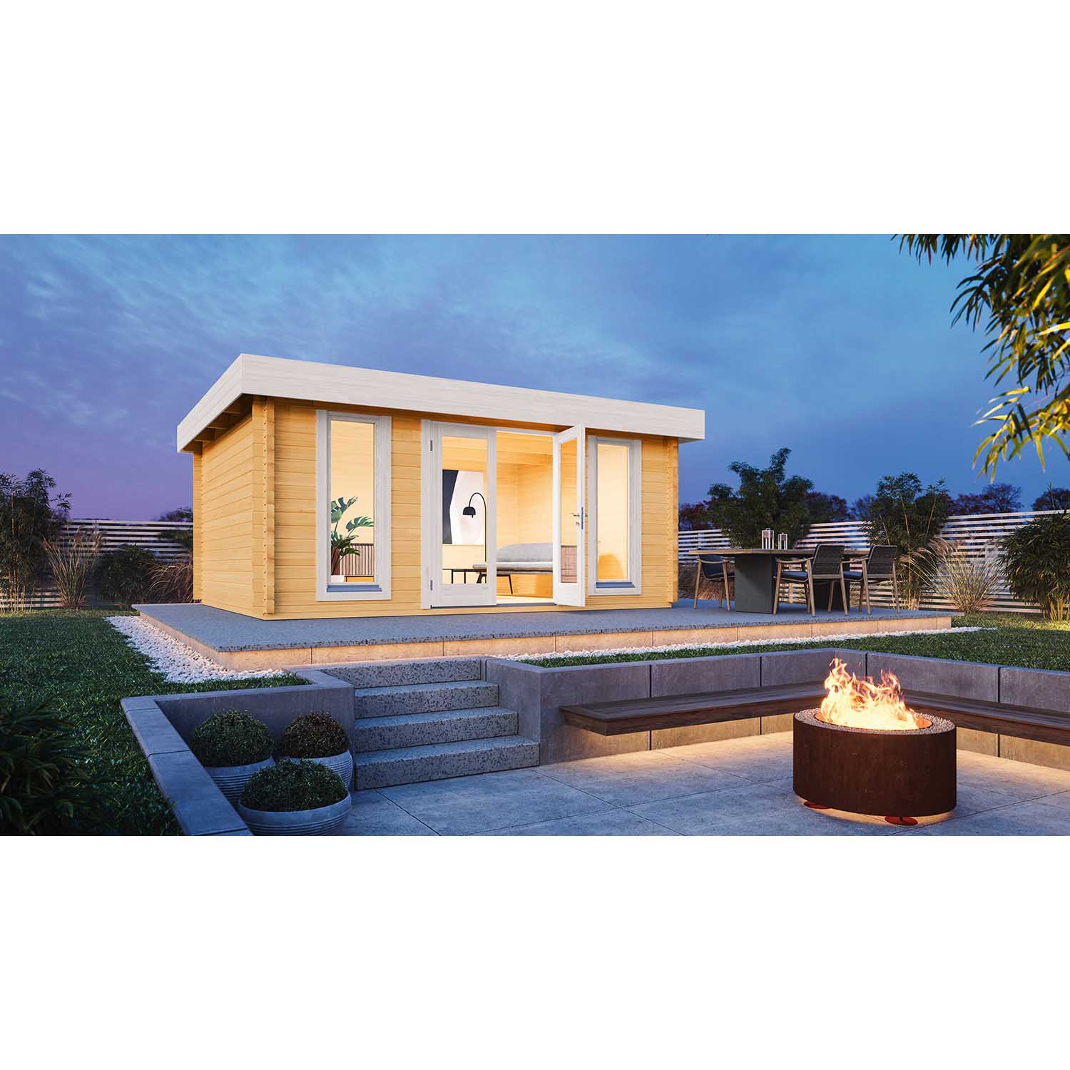 nordischer Fichte 44 mm Wandstärke XL-Doppeltür isoliert 145 x 195 cm 2 Bodentiefe Fenster Isolierverglast 46 x 159 cm Wandaußenmaß Haus (B x T): 450 x 360 cm Farbe Fichte...