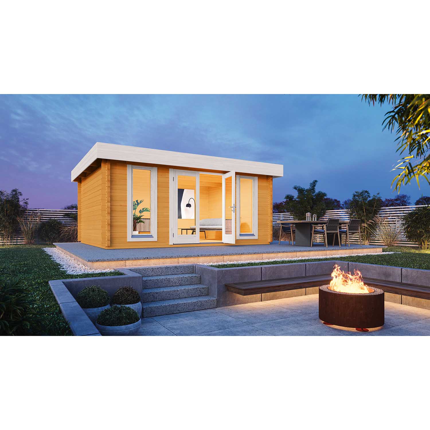 nordischer Fichte 44 mm Wandstärke XL-Doppeltür isoliert 145 x 195 cm 2 Bodentiefe Fenster Isolierverglast 46 x 159 cm Wandaußenmaß Haus (B x T): 450 x 360 cm Farbe Bernstein...