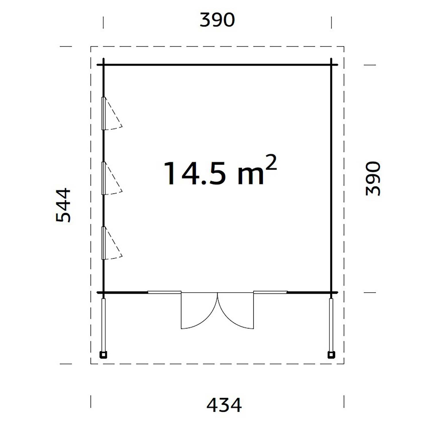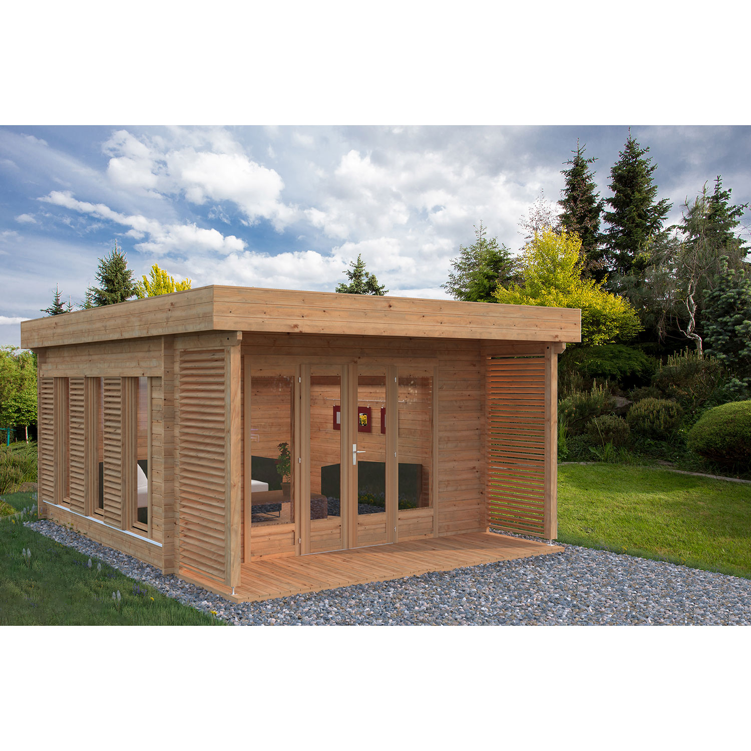 Wandstärke: 44 mm Material: nordisches Fichtenholz Dachform: Flachdach Farbbehandlung / Farbe: hellbraun tauchgrundiert Grundfläche: 14,5 m² Umbauter Raum: 32,5 m³ Tür: Doppeltür Tür /...