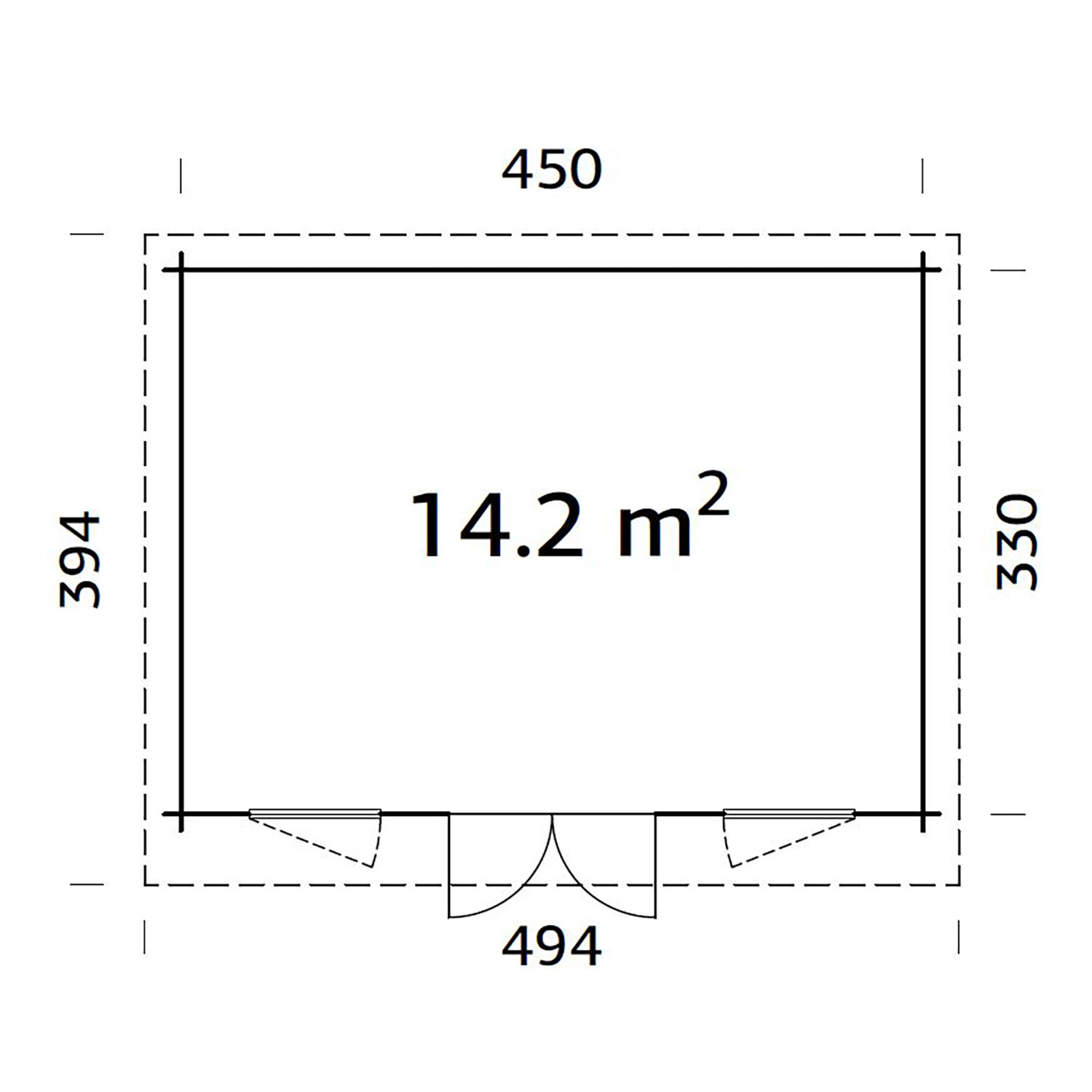 Wandstärke: 44 mm Material: nordisches Fichtenholz Dachform: Pultdach Farbbehandlung / Farbe: grau tauchgrundiert Grundfläche: 14,2 m² Umbauter Raum: 31,6 m³ Tür: Doppeltür Tür /...