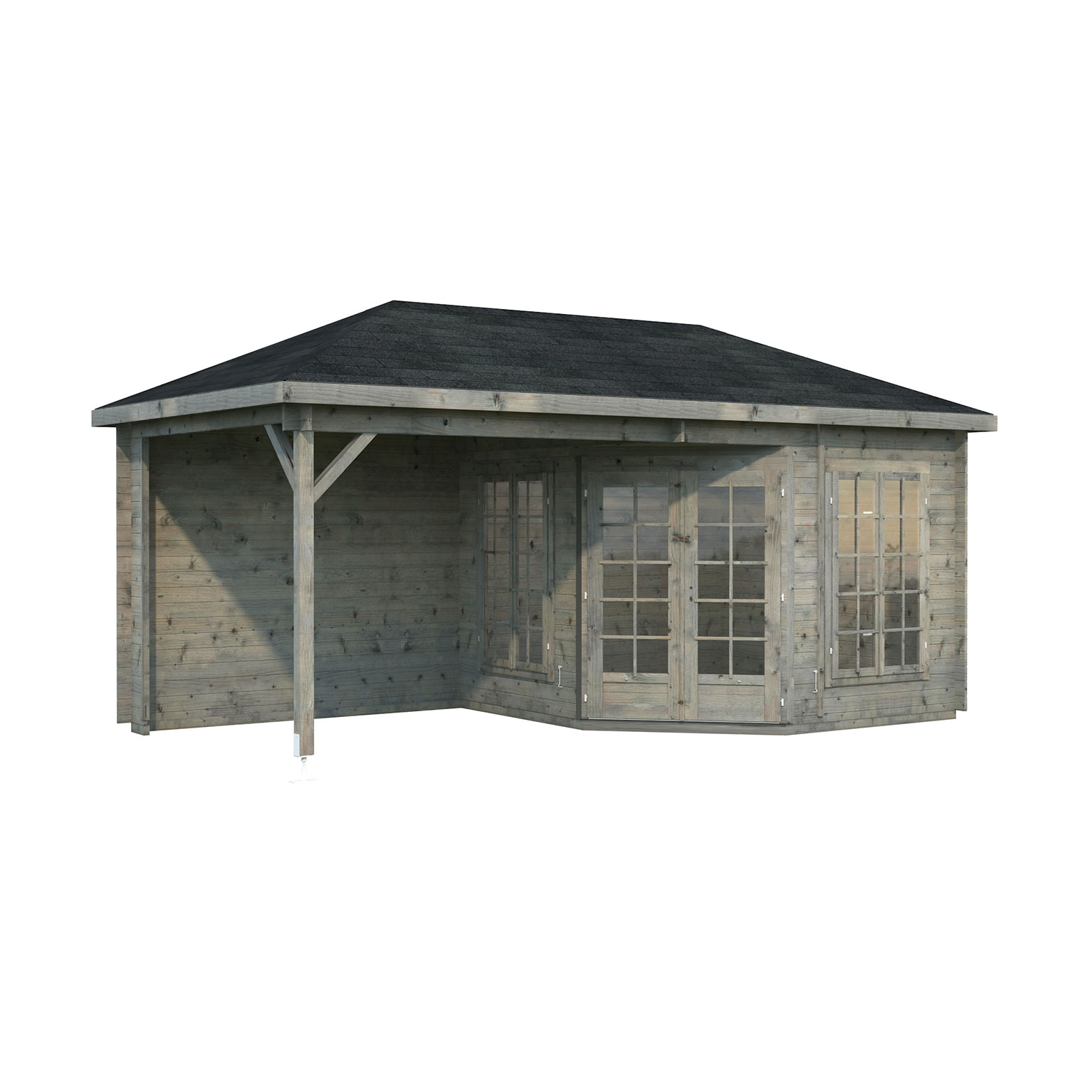 Wandstärke: 28 mm Material: nordisches Fichtenholz Dachform: Walmdach Farbbehandlung / Farbe: grau tauchgrundiert Grundfläche: 7,0+8,1 m² Umbauter Raum: 39,6 m³ Tür: Doppeltür Tür /...