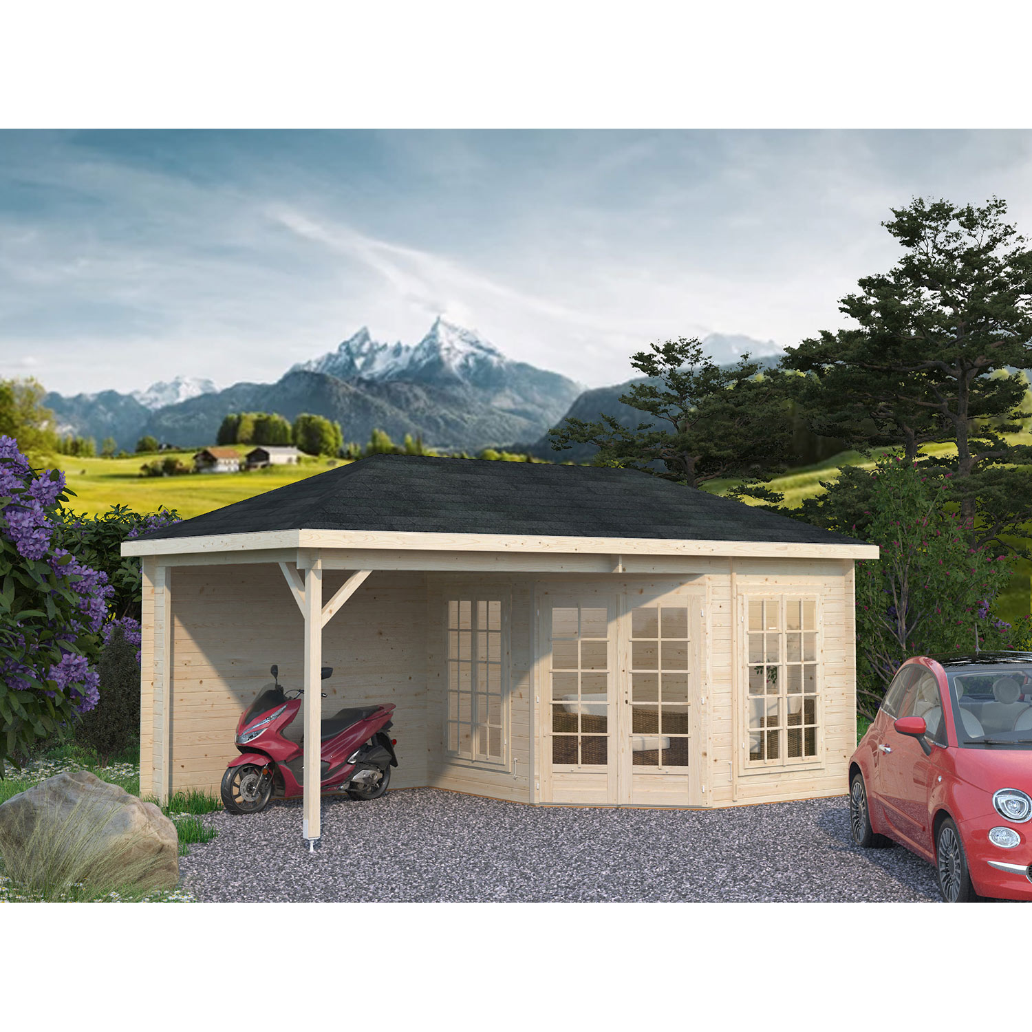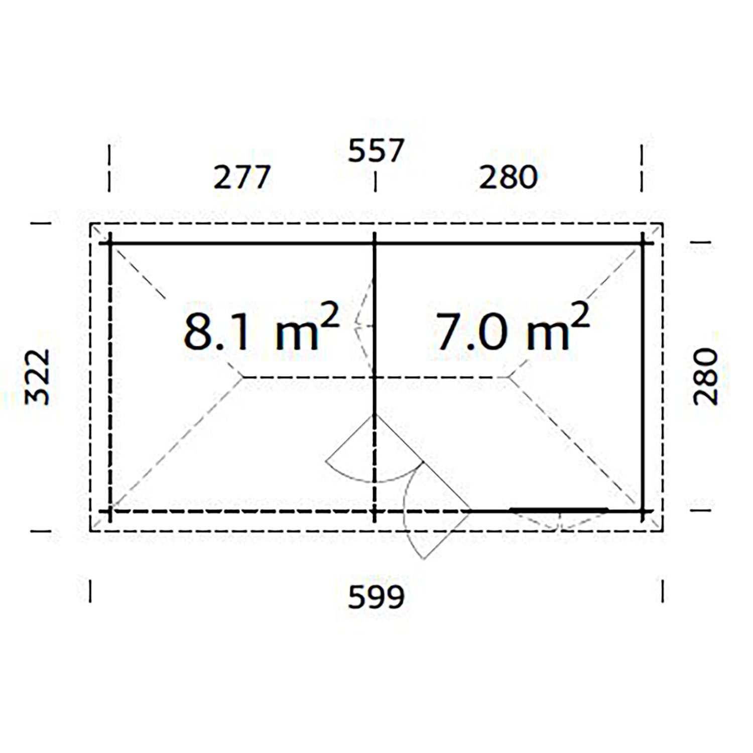 Wandstärke: 28 mm Material: nordisches Fichtenholz Dachform: Zeltdach Farbbehandlung / Farbe: transparent tauchgrundiert Grundfläche: 7,0+8,1 m² Umbauter Raum: 39,6 m³ Tür: Doppeltür Tür /...