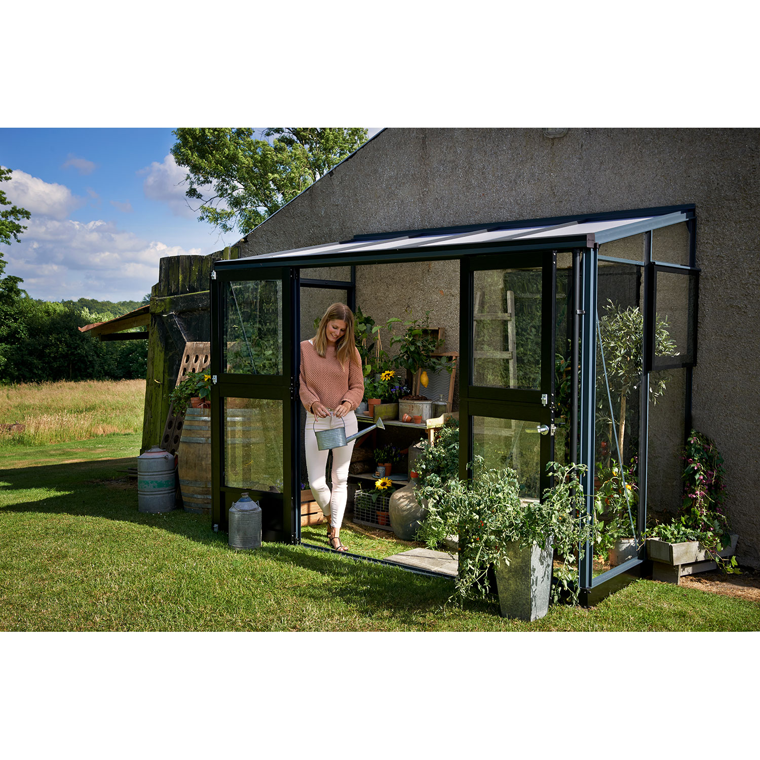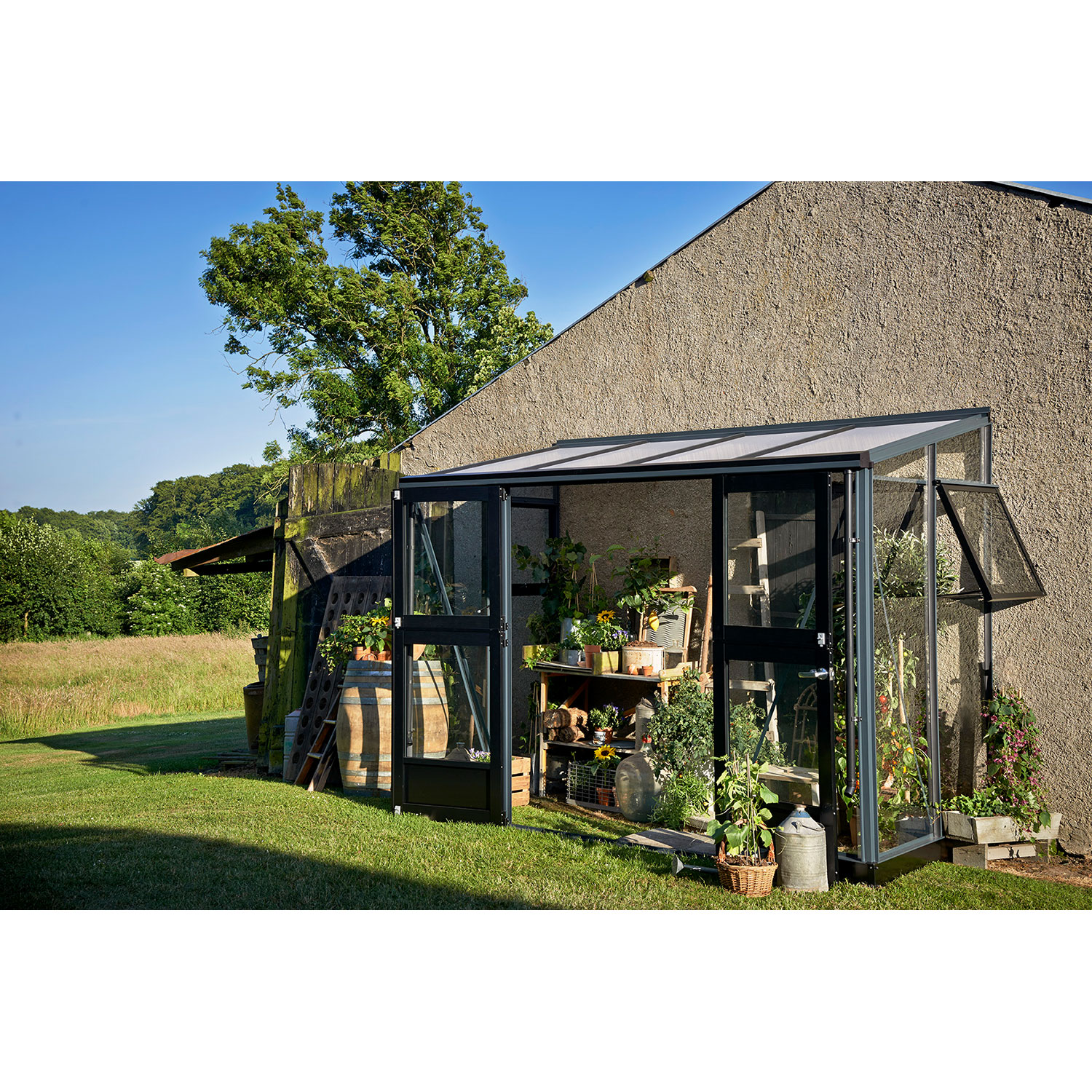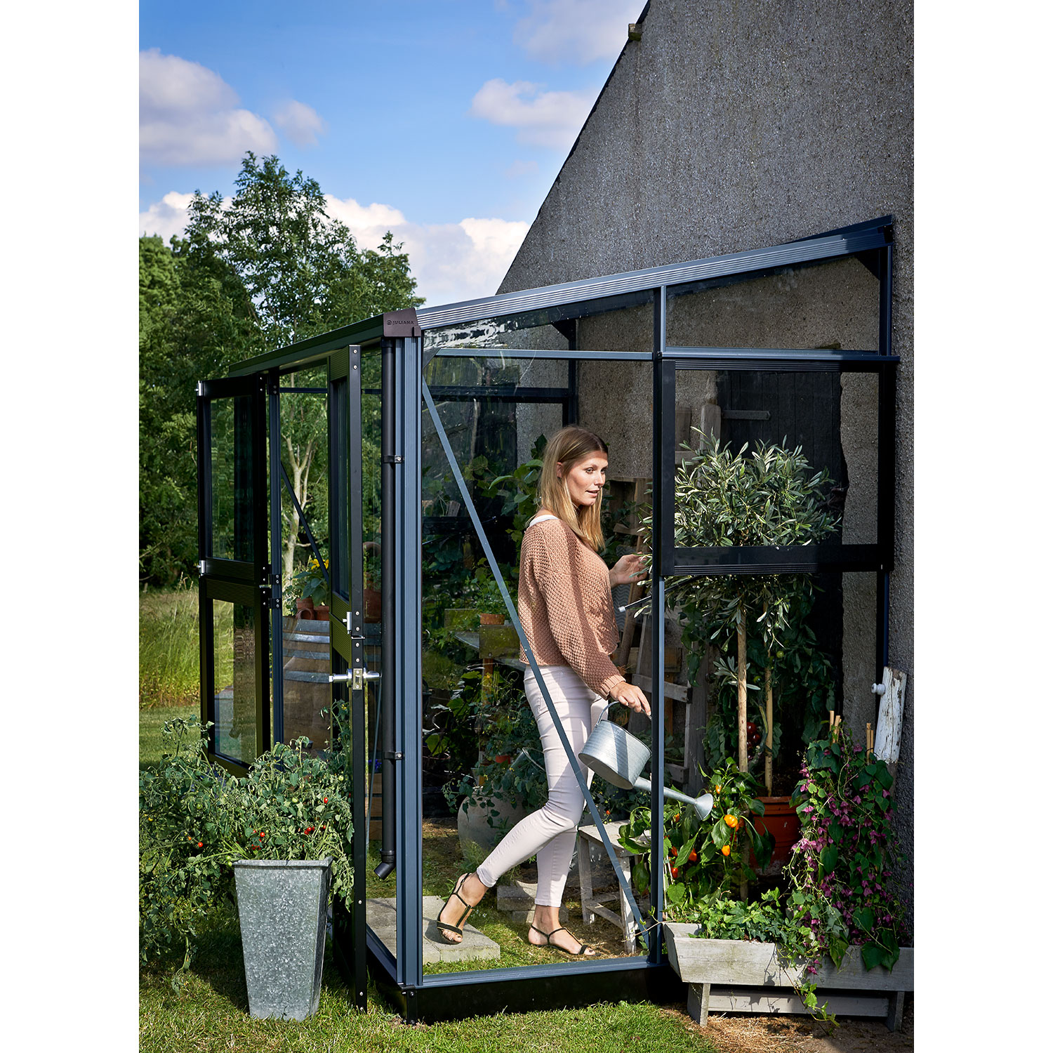 Juliana Veranda eignet sich für Gärten mit einer ungenutzten Hauswand. Steht das Gewächshaus an einer Hauswand, werden beide tagsüber von der Sonne erwärmt. Nachts gibt das Mauerwerk die gespeicherte Wärme an das Gewächshaus ab und schafft so gute Wachstumsbedingungen zu Beginn und am Ende der Saison.