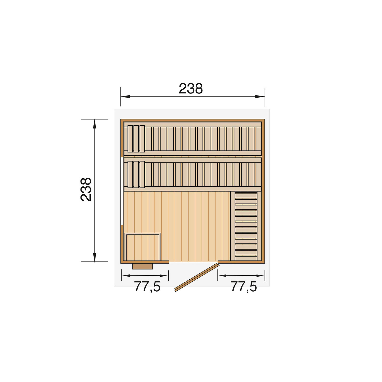Die Sauna verfügt über ein Außenmaß von 263 cm x 298 cm. Die Grundfläche der Sauna beträgt 5,66 m².