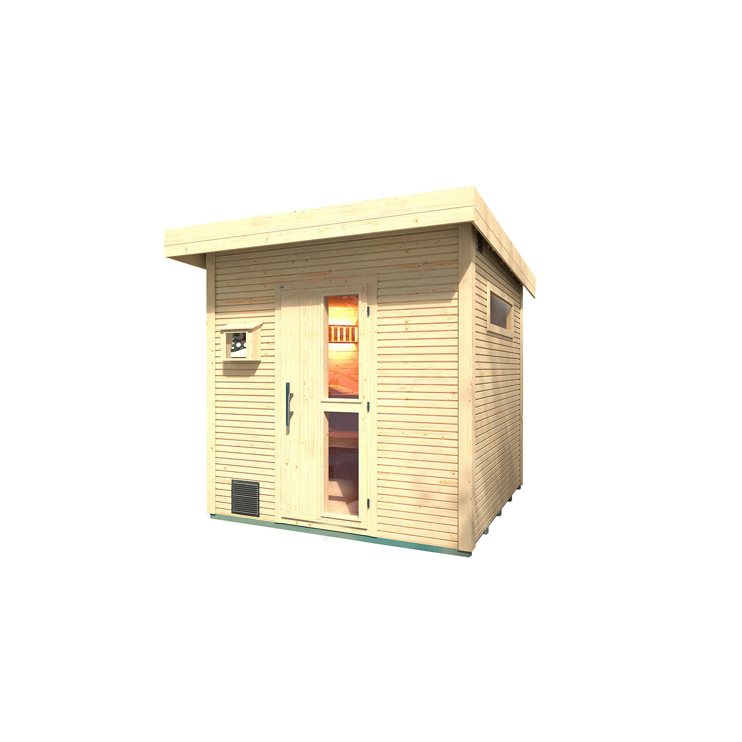 Die Sauna verfügt über ein Außenmaß von 263 cm x 298 cm. Die Grundfläche der Sauna beträgt 5,66 m².