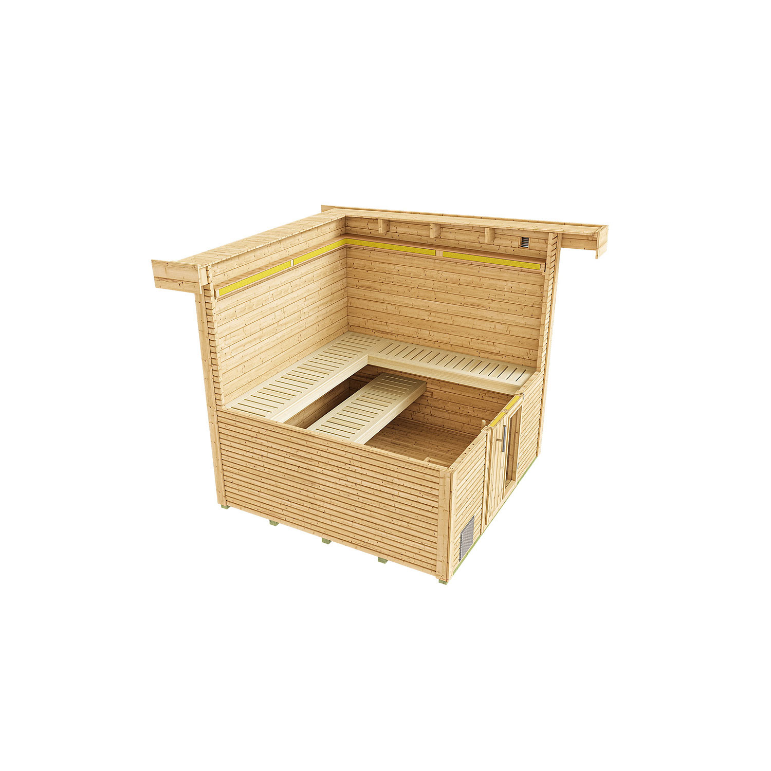 Mit dem Design-Saunahaus Kuopio BioS Sparset können Sie saunieren und gleichzeitig entspannen. Die speziell isolierte Tür und Zwischendecke sorgen für optimales Raumklima und die Wärme bleibt im Inneren des Hauses.