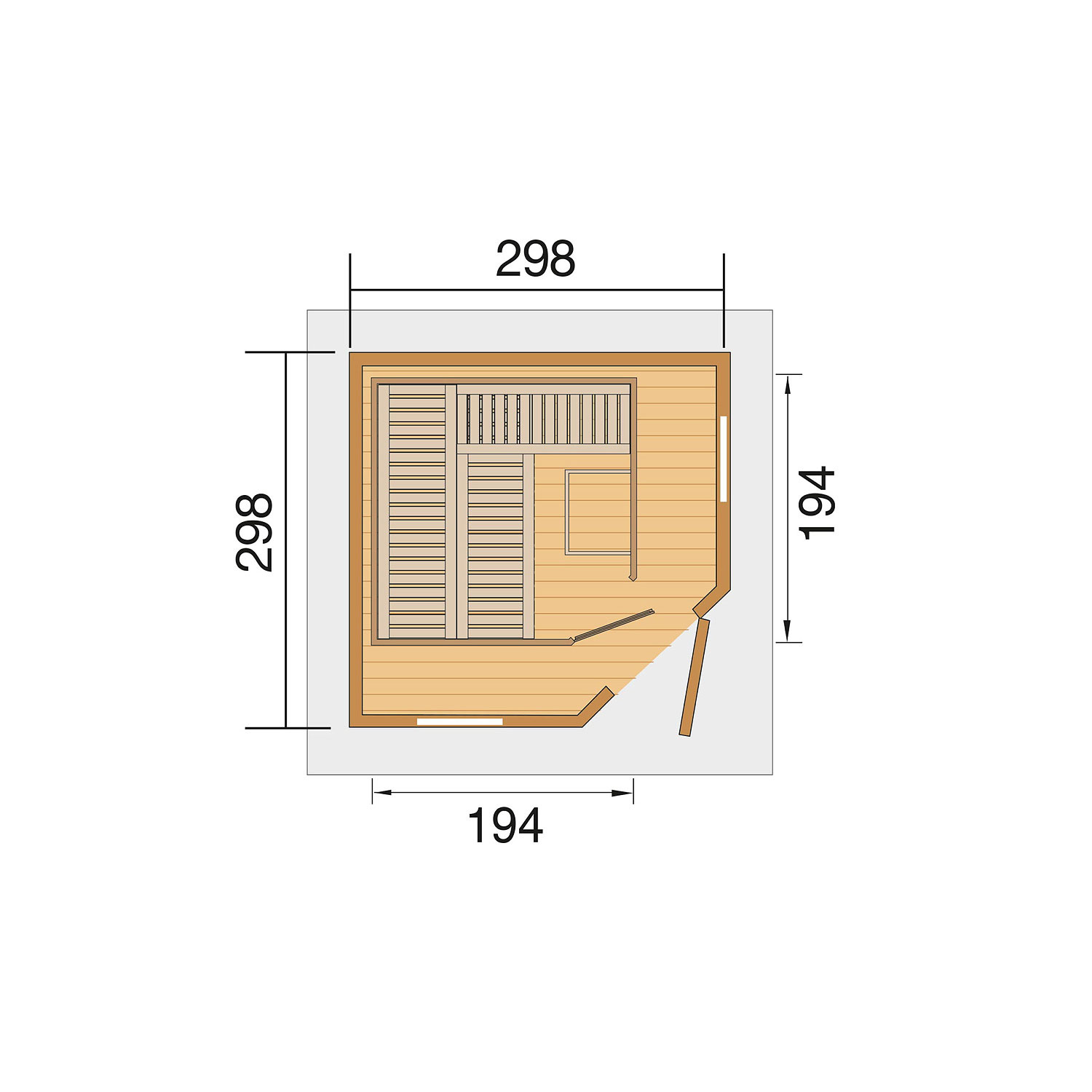 Das Saunahaus verfügt über ein Außenmaß von 380 cm x 380 cm. Die Grundfläche der Sauna beträgt 8,88 m².
