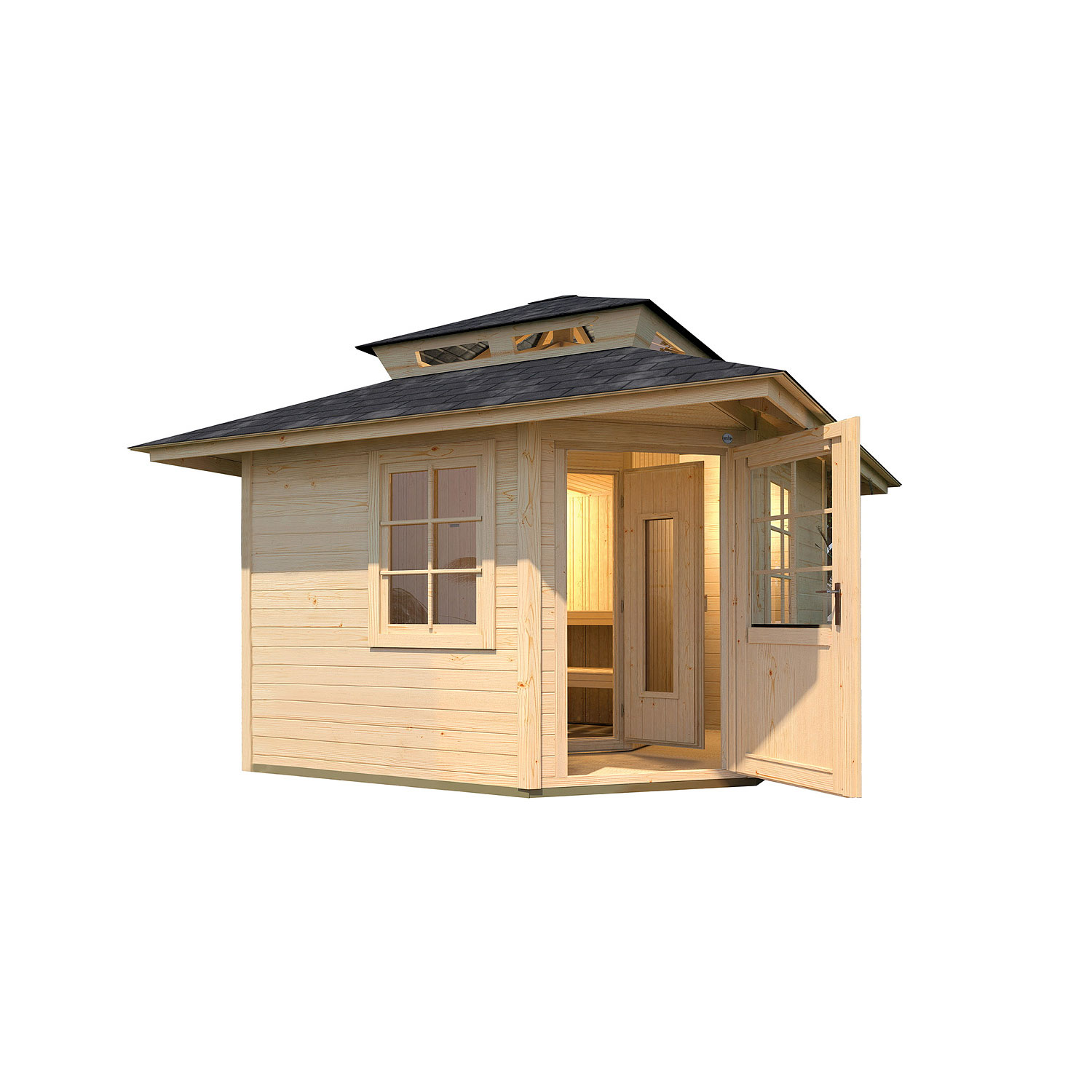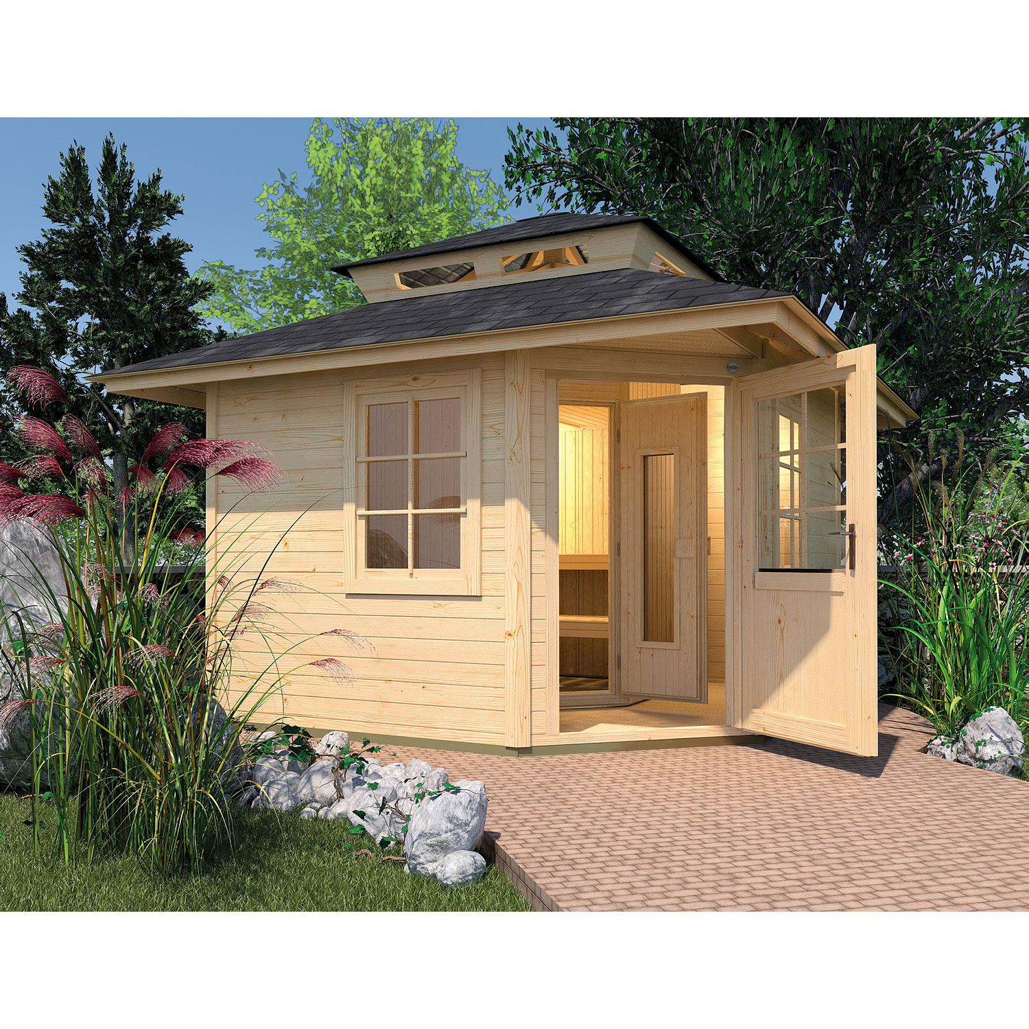 Saunahaus aus 28 mm Blockbohlen mit 19 mm Massivholzdach inklusive hochwertiger Elementsauna "Varberg 3" spezielle Holztür für beste Isolation und optimales Saunaklima zwei...