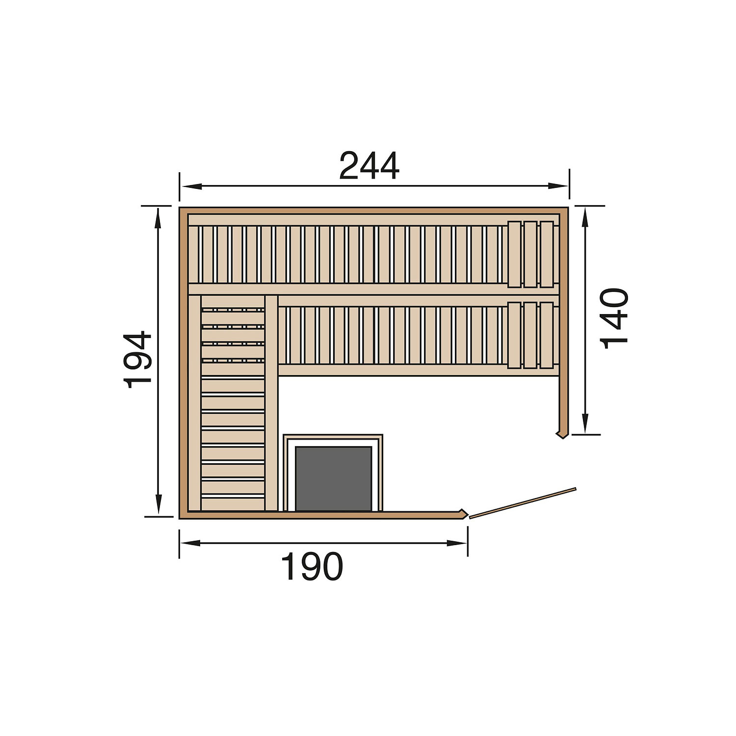Die Sauna verfügt über ein Außenmaß von 244 cm x 194 cm. Die Grundfläche der Sauna beträgt 4,65 m².