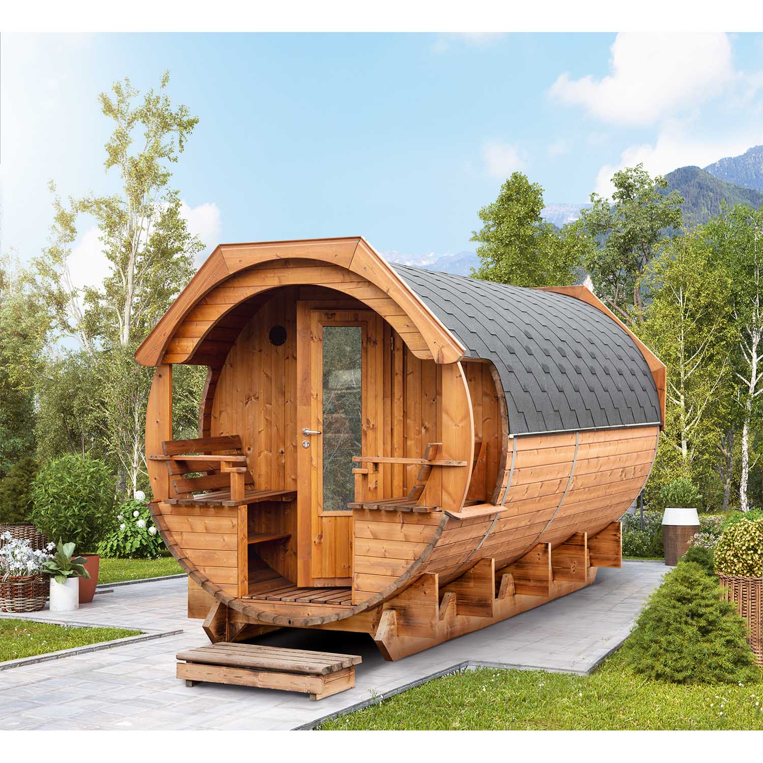 Dateien & Downloads "Wolff Finnhaus Saunafass Premium Svenja 2 Thermoholz montiert"