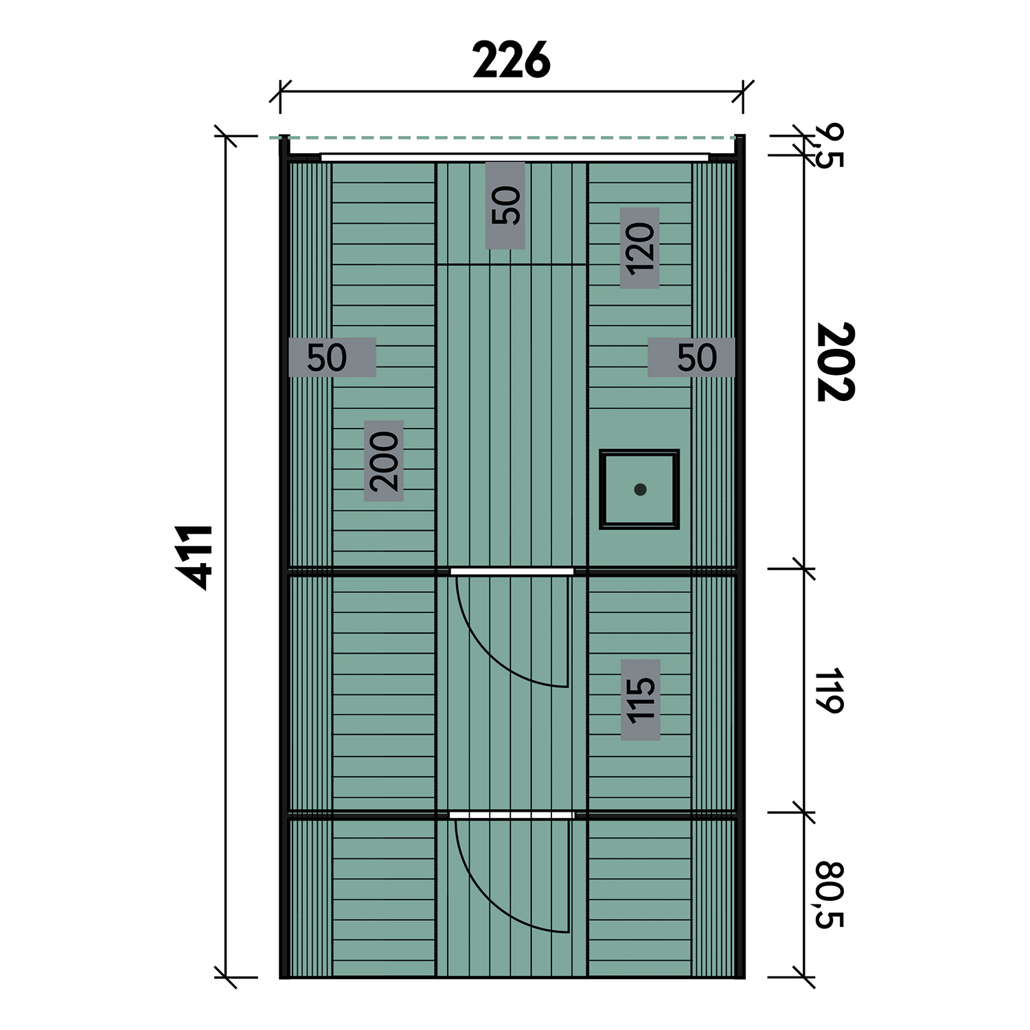 • Außenmaß (B x T): 226 x 411 cm
