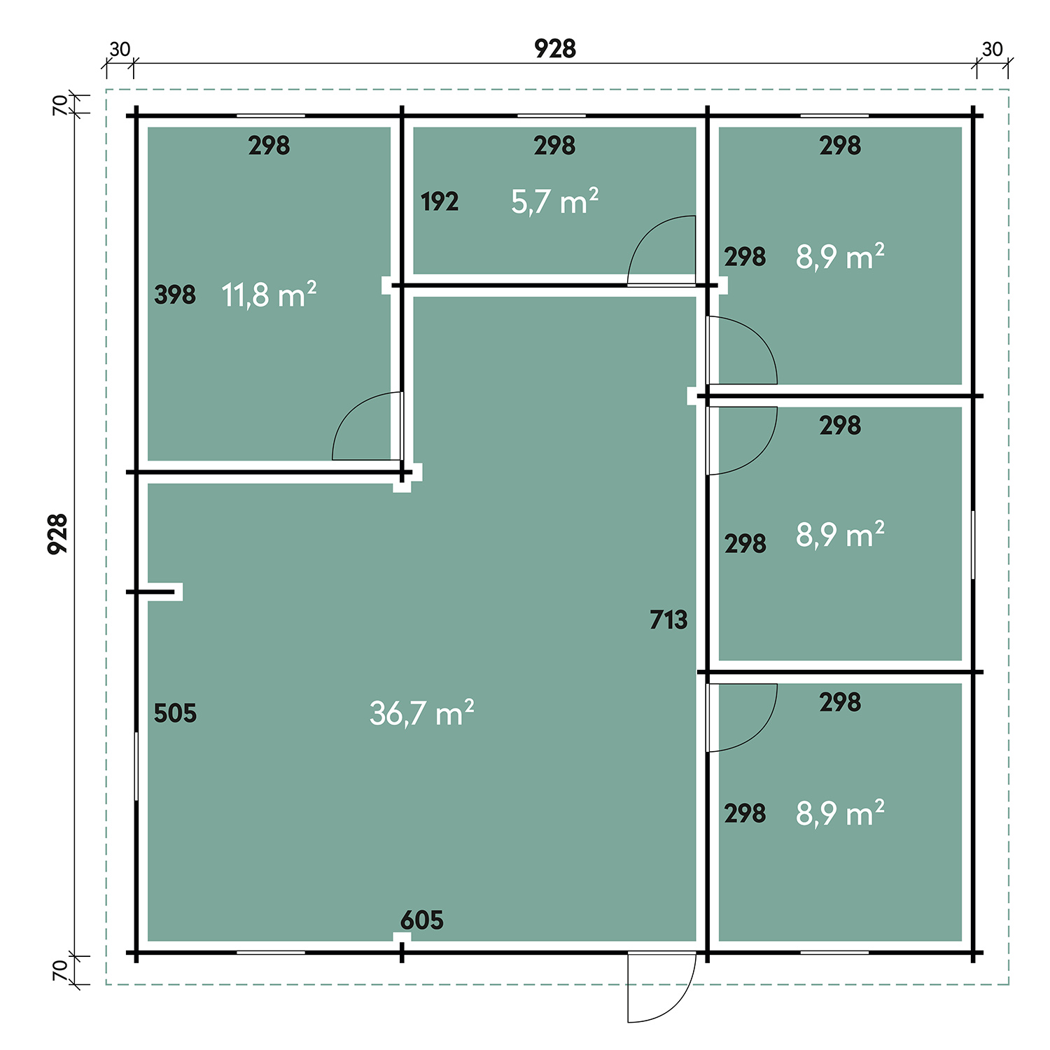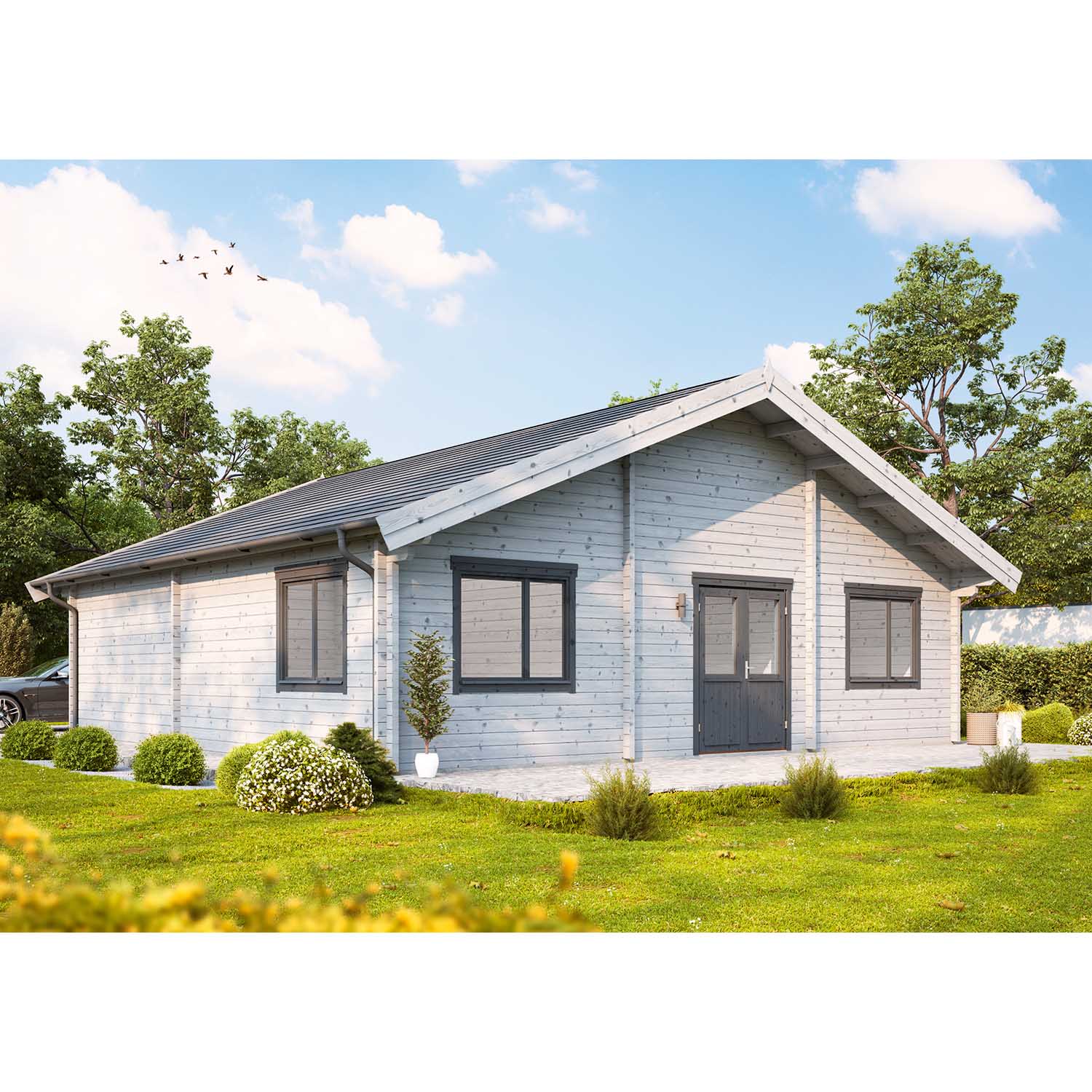 Das Wolff Finnhaus Westerwald 92 ist die ideale Wahl für ein komfortables und großes Ferienhaus. Die insgesamt 6 Räume können beispielsweise als Wohnraum, Schlafzimmer, Kinderzimmer, Küche, Speisekammer und Bad genutzt werden. 7 Fenster sorgen für herrlichen Lichteinfall und die 92 mm starken Wände schützen hervorragend vor kühleren Temperaturen. So können Sie Ihr Wochenendhaus auch im Spätsommer oder Herbst wunderbar nutzen. Die modernen Fenster und die halbverglaste Tür geben dem Ferienhaus einen eleganten Charme, der zum entspannen und erholen einlädt. Das Haus bietet eine Fläche von 81 m² und ein Raumvolumen von 285 m³.