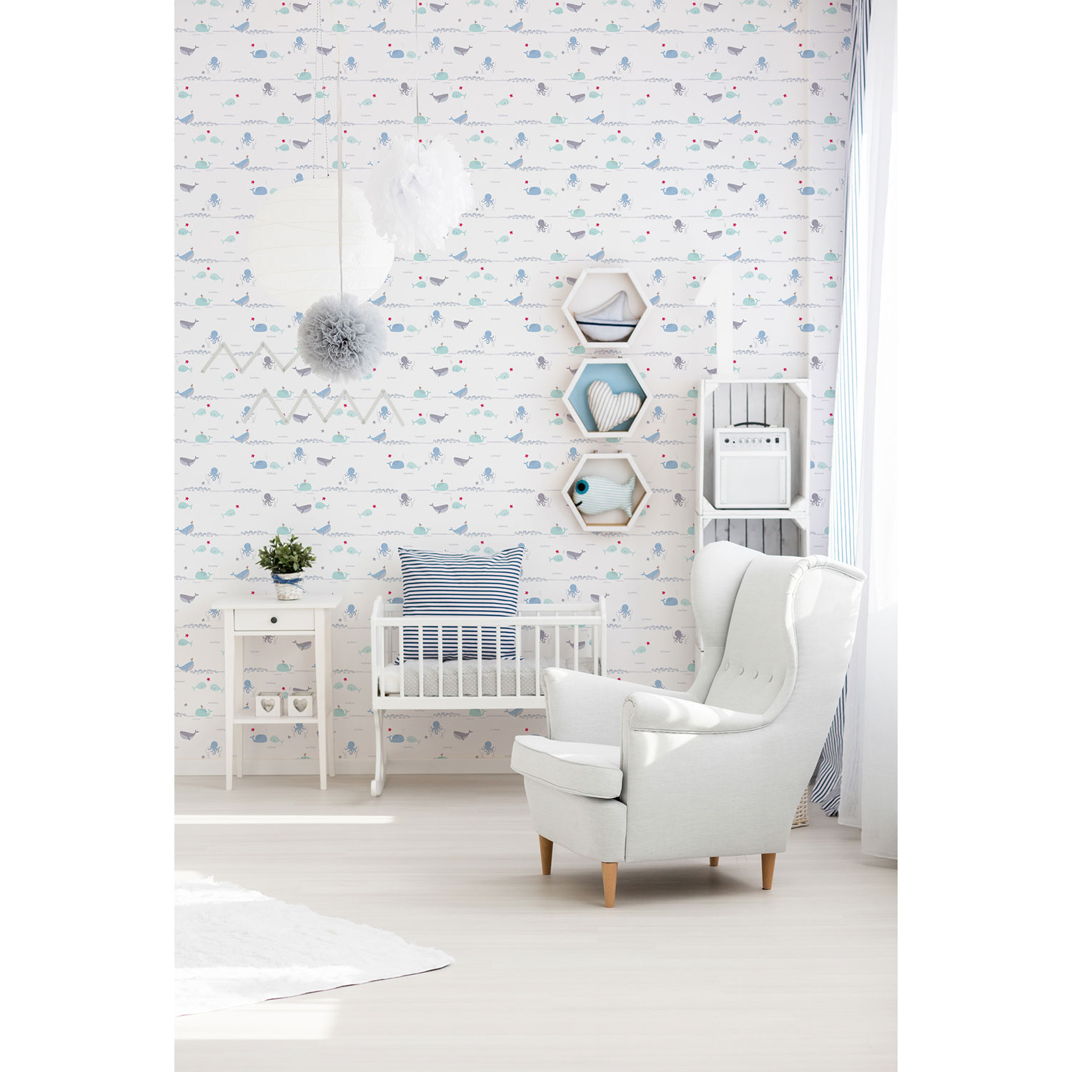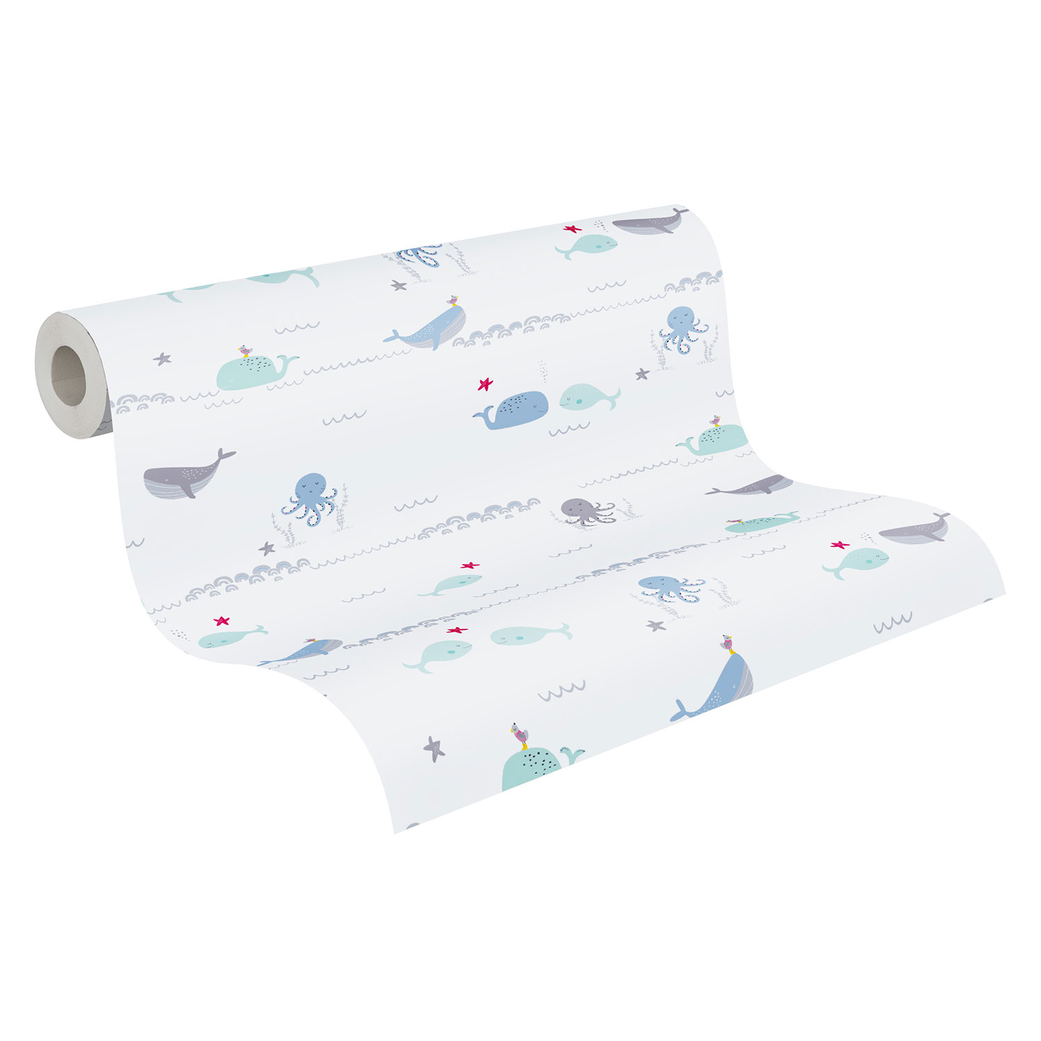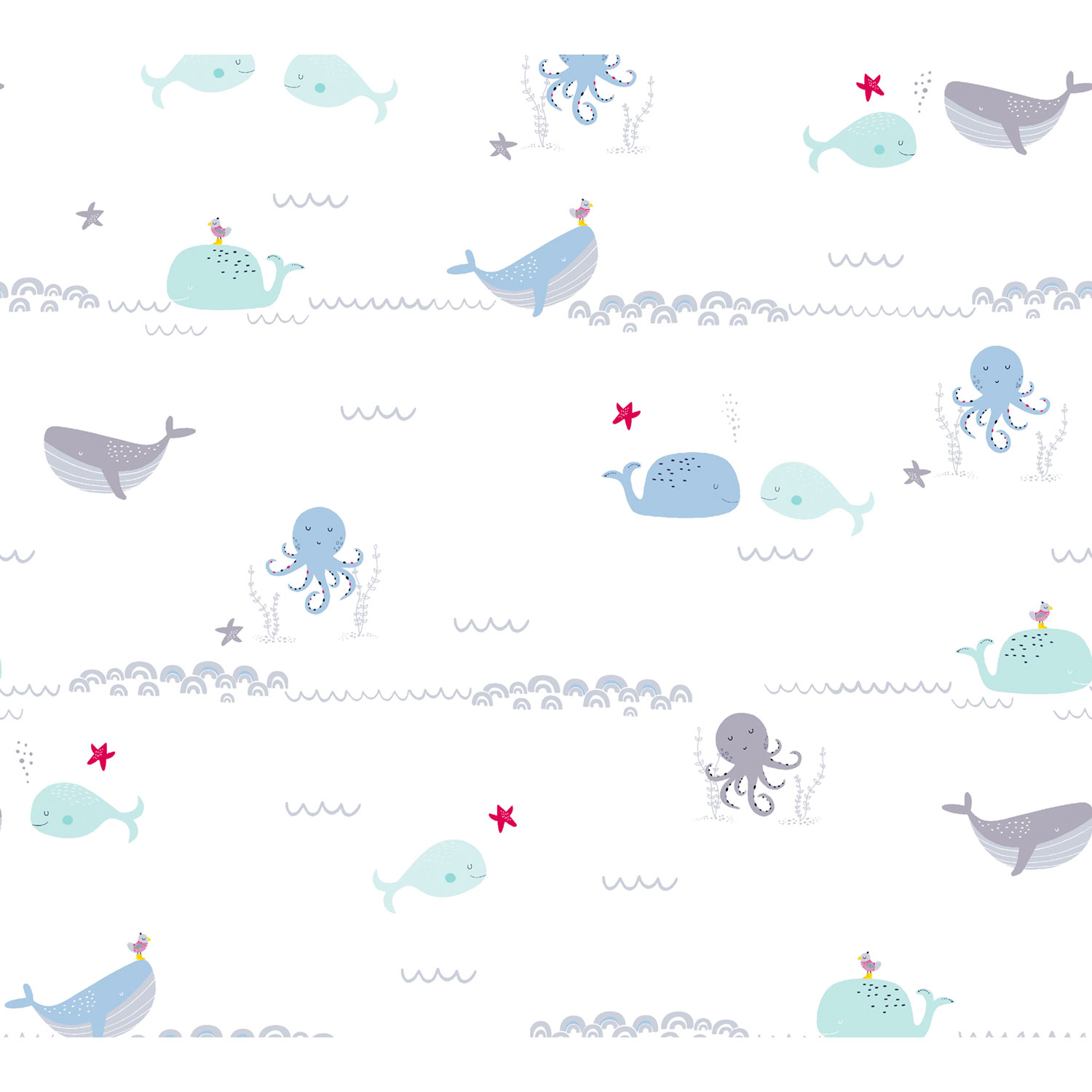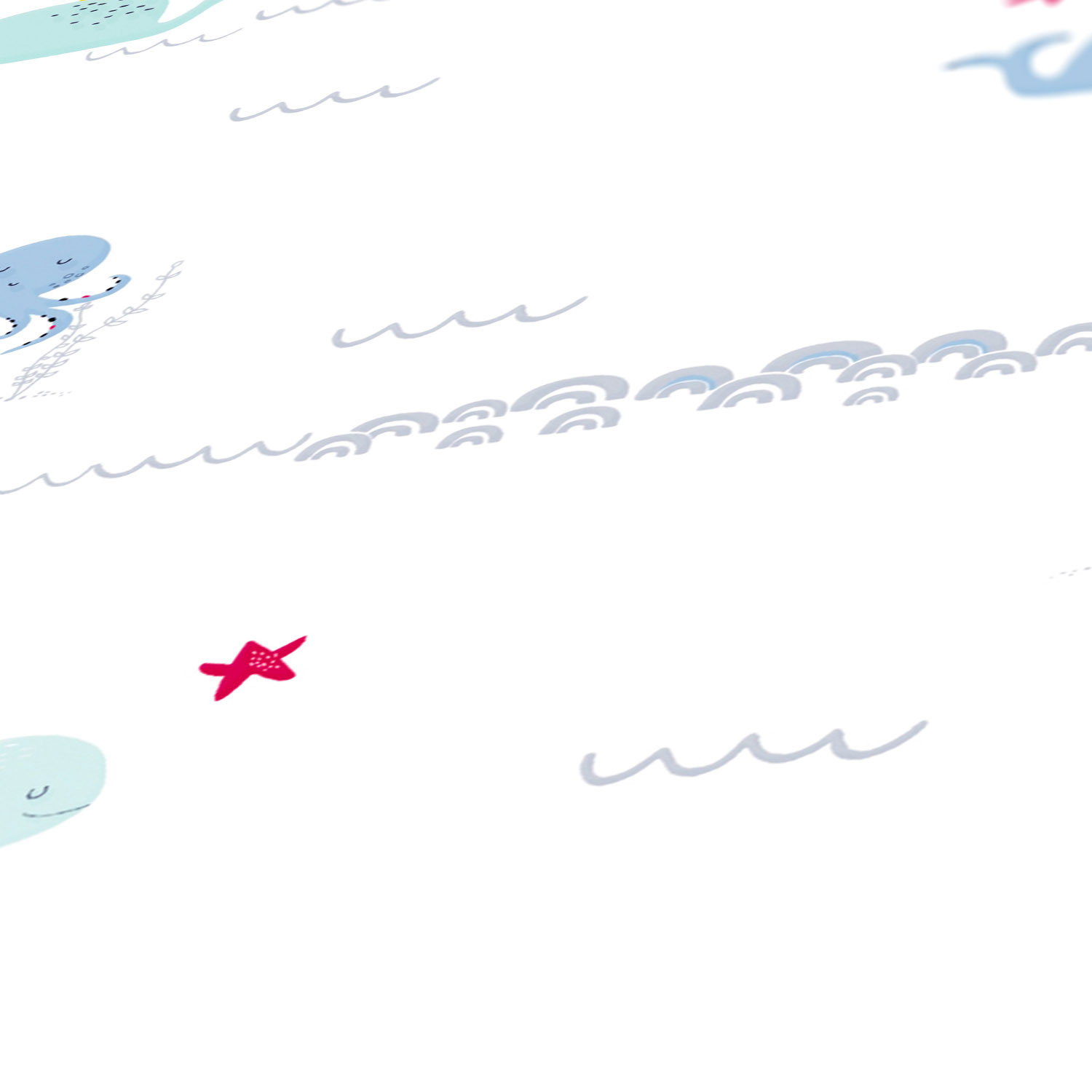 Die Wale, Kraken und Unterwasser-Motive lassen Kinderherzen höherschlagen. Somit präsentiert sich die Tapete niedlich und fantasievoll.