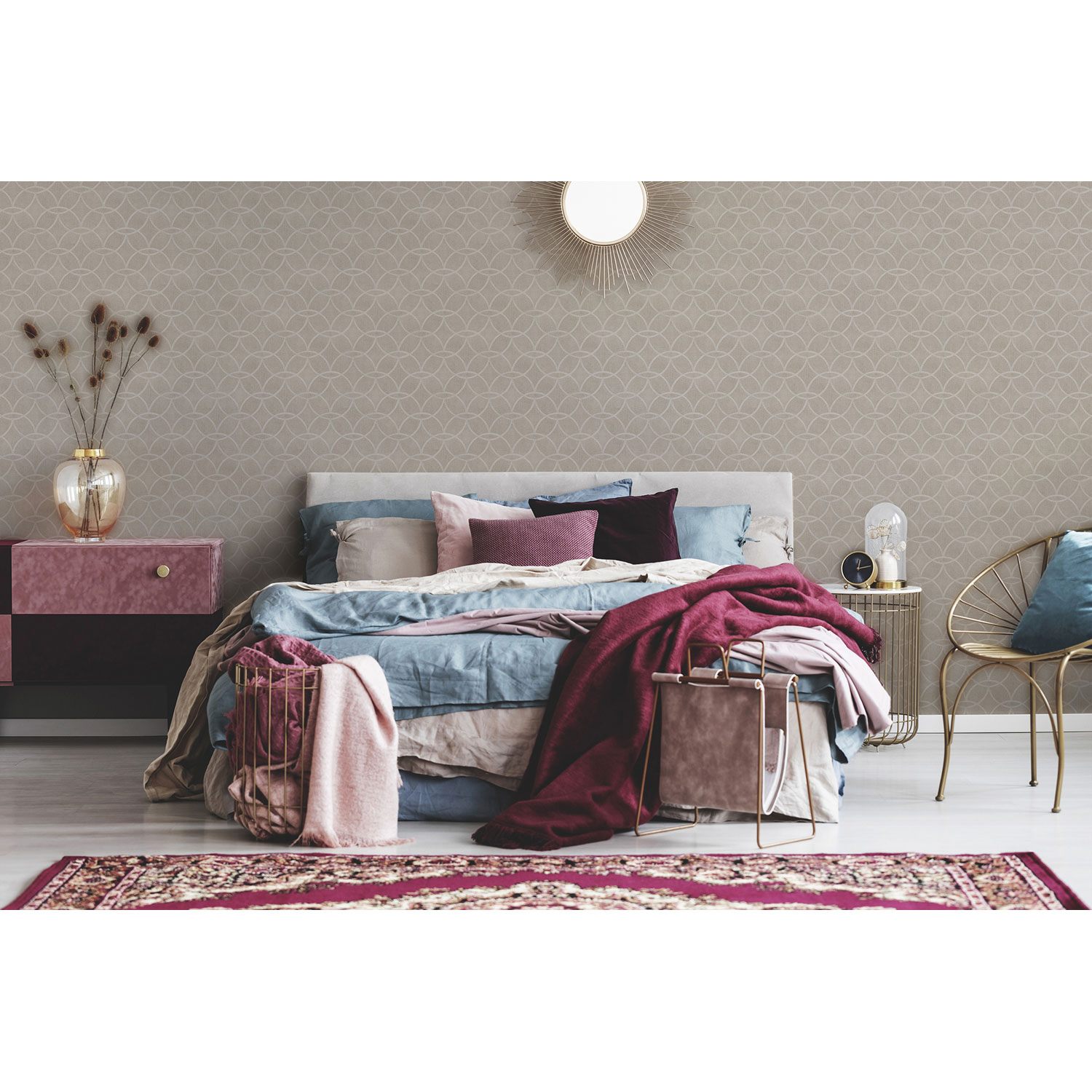 Mit geometrischen Muster mit glänzendem Metallic-Effekt wird subtiler Luxus repräsentiert. Somit eignet sich das Design perfekt für moderne und stilvoll eingerichtete Wohnräume.