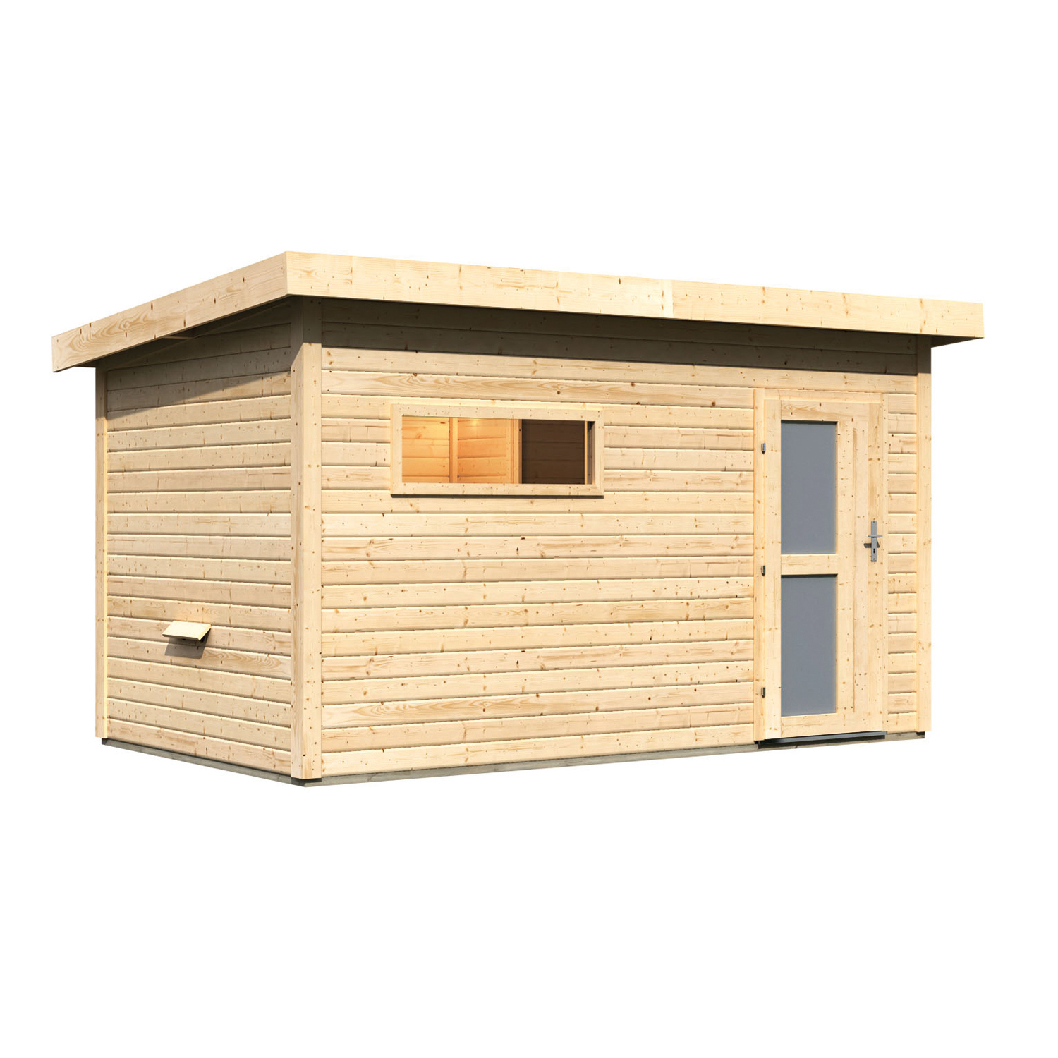40 mm Wandstärke nordische Fichte Pultdach inkl. Fußboden 3 Saunabänke Espenholz Isolierte Zwischendecke gedämmte Außentür Isolierverglast halbglas 78 x 175 cm bronzierte...