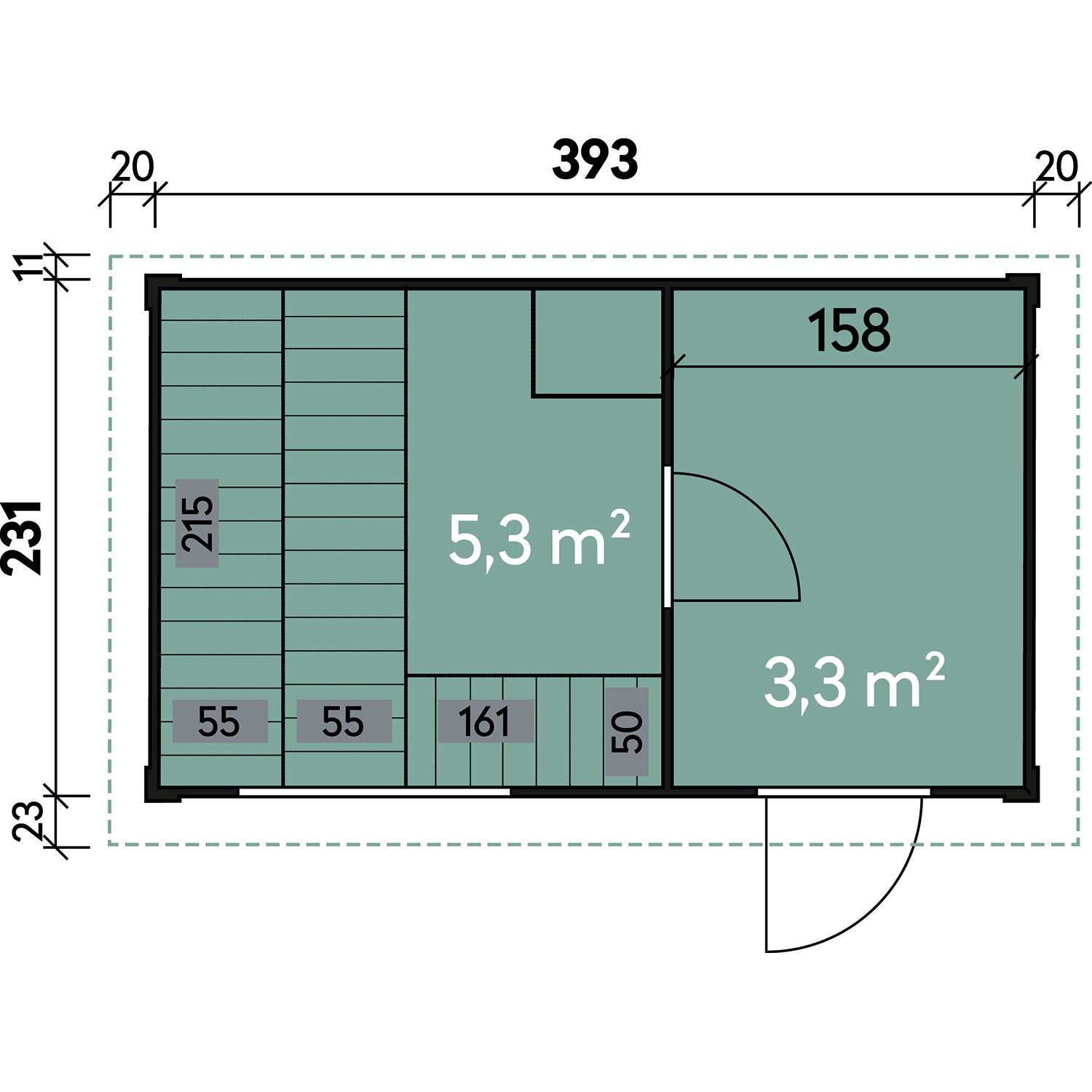• Wandaußenmaß Haus (B x T): 393 x 231 cm