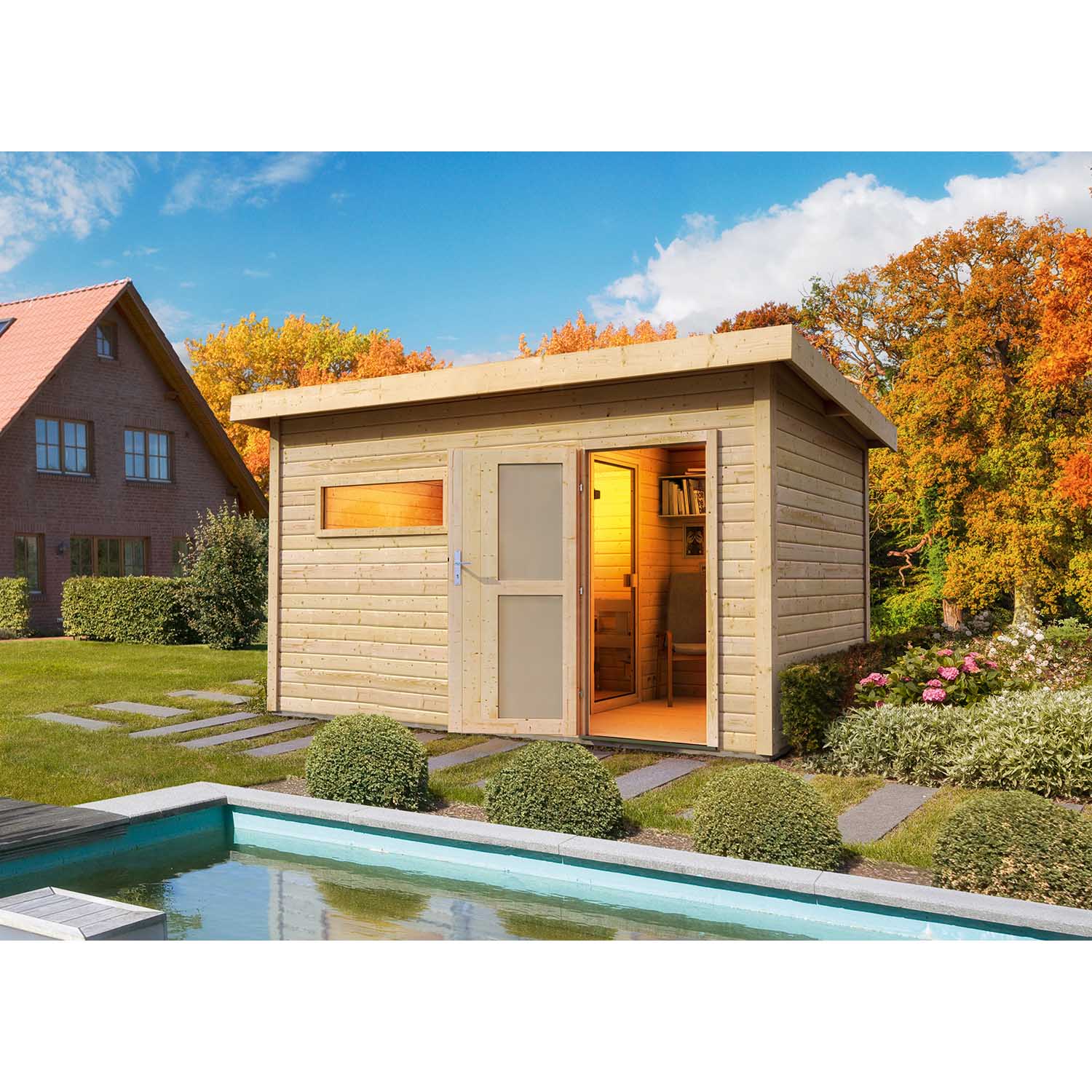40 mm Wandstärke nordische Fichte Pultdach inkl. Fußboden 3 Saunabänke Espenholz Bioofen mit externer Steuerung, 9 KW sechsteiliges Saunaset Isolierte Dachelemente...